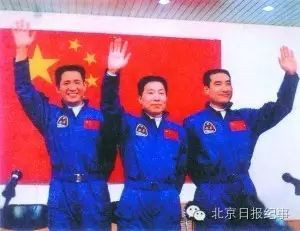 “神五”首飞梯队亮相,从左至右依次为:聂海胜、杨利伟、翟志刚。